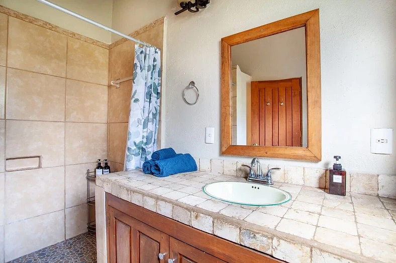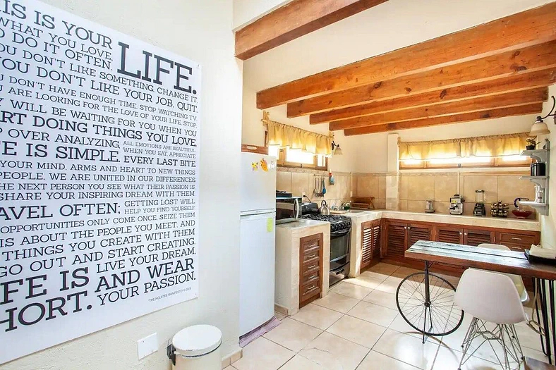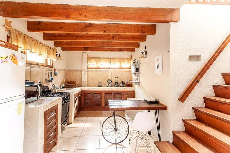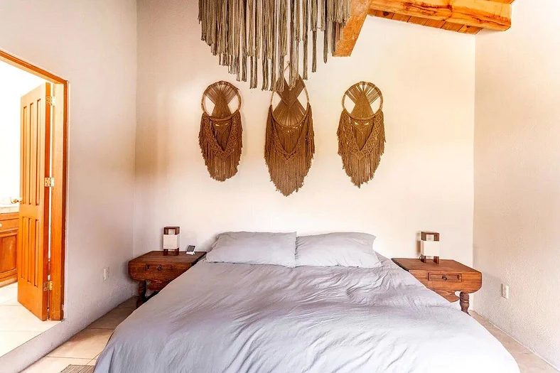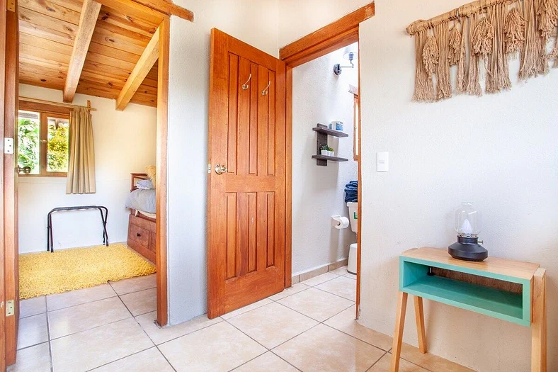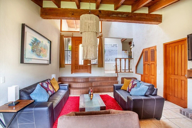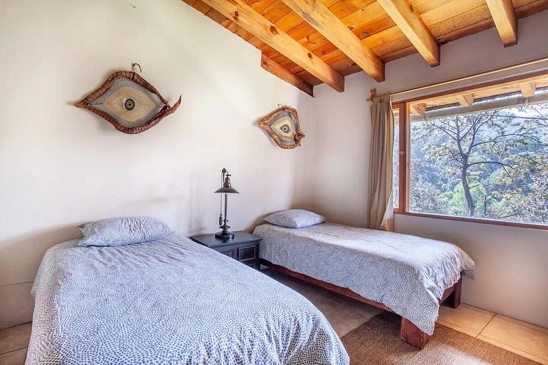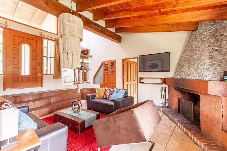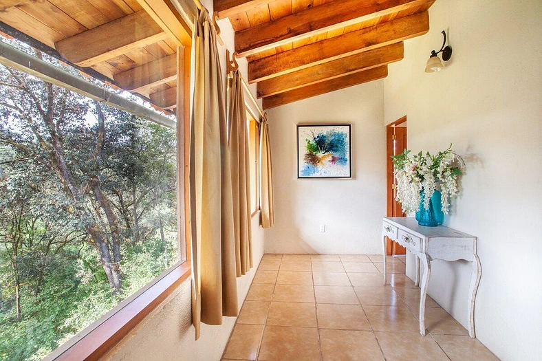 Casa del Bosque está ubicada en una pequeña privada con solamente 7 casas. La terraza tiene una vista espectacular al bosque, un jacuzzi exterior (costo extra), una sala exterior, y un BBQ. Hay camastros del sol para relajarte y disfrutar la vista o leer un buen libro. Puedes caminar abajo al rio donde voy a meditar ya que está tranquilo y está rodeado del agua y mini cascadas. En la noche puedes cocinar una cena en la cocina que está completamente equipada, pasar el tiempo al lado de la chimenea o calentarte en el jacuzzi. Es un escape perfecto lejos del caos y multitudes de gente de la ciudad. Mascotas son bienvenidas solo 2 Razas medianas y pequeñas únicamente
