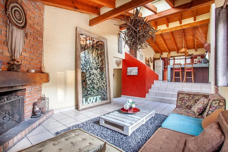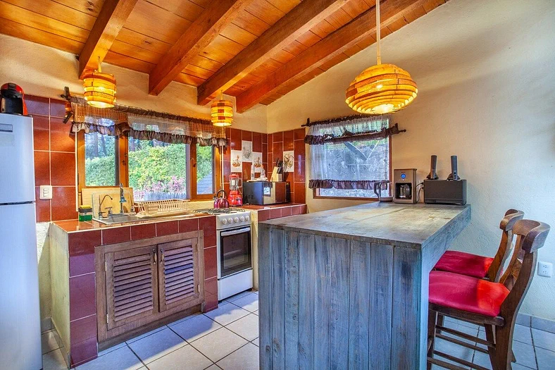 Casa Valle está ubicada en una pequeña privada con solamente 7 casas. La terraza tiene una vista espectacular al bosque, un jacuzzi exterior (costo extra), una sala exterior, y un BBQ. Hay camastros del sol para relajarte y disfrutar la vista o leer un buen libro. Puedes caminar abajo al rio donde voy a meditar ya que está tranquilo y está rodeado del agua y mini cascadas. En la noche puedes cocinar una cena en la cocina que está completamente equipada, pasar el tiempo al lado de la chimenea o calentarte en el jacuzzi. Es un escape perfecto lejos del caos y multitudes de gente de la ciudad. Actualmente NO se permiten mascotas.